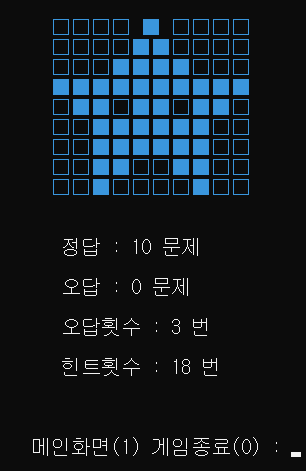 처음으로 만들어본 자작 콘솔게임인데 생각보다 콘솔 창 함수의 사용법만 안다면 누구나 만들 수 있었다. 다음 시간 날 때 문제를 랜덤으로 섞어서 나오게 하고 난이도를 골라 어려운 버전도 만들어 보고 싶다. 지금 0.1 버전도 이해 안 되는 문제가 있을 수 있으니 ㅎㅎ 코드에 주석으로 짧은 설명이 있으니 이해가 안 되는 부분은 확인하면 될 것 같다.